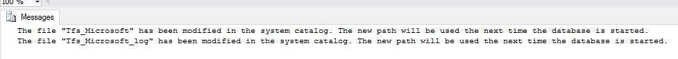 Recently I restored and moved some TFS databases around, and one of them remained on a temporary storage because of the massive size involved. After a while I managed to sort out the primary storage so I could move this database (and its Transaction Log) back to it.