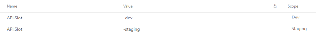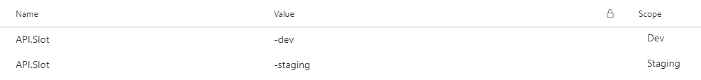 The best approach here, given the relative complexity of this exercise, is to scope the relevant value by environment. The Dev environment will always point at the Dev environment, Staging to Staging, and the last two environments are effectively production so I do not need to worry about adding a slot. It's not like I have cross-environment settings here.